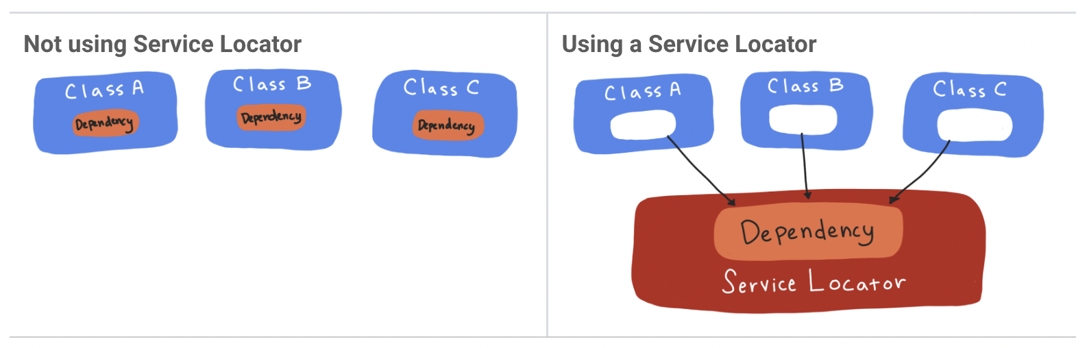 ServiceLocator pattern은 "ServiceLocator"라는 Singleton 클래스를 만들고, 이 클래스에서 실제 코드와 테스트 코드 모두에 의존성을 제공해주는 디자인 패턴입니다.