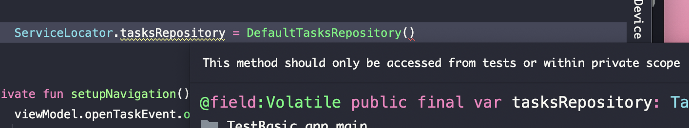 만약 main source set에서 taskRepository의 setter에 접근하려고 하면 아래와 같이 경고가 나타날 것입니다.
