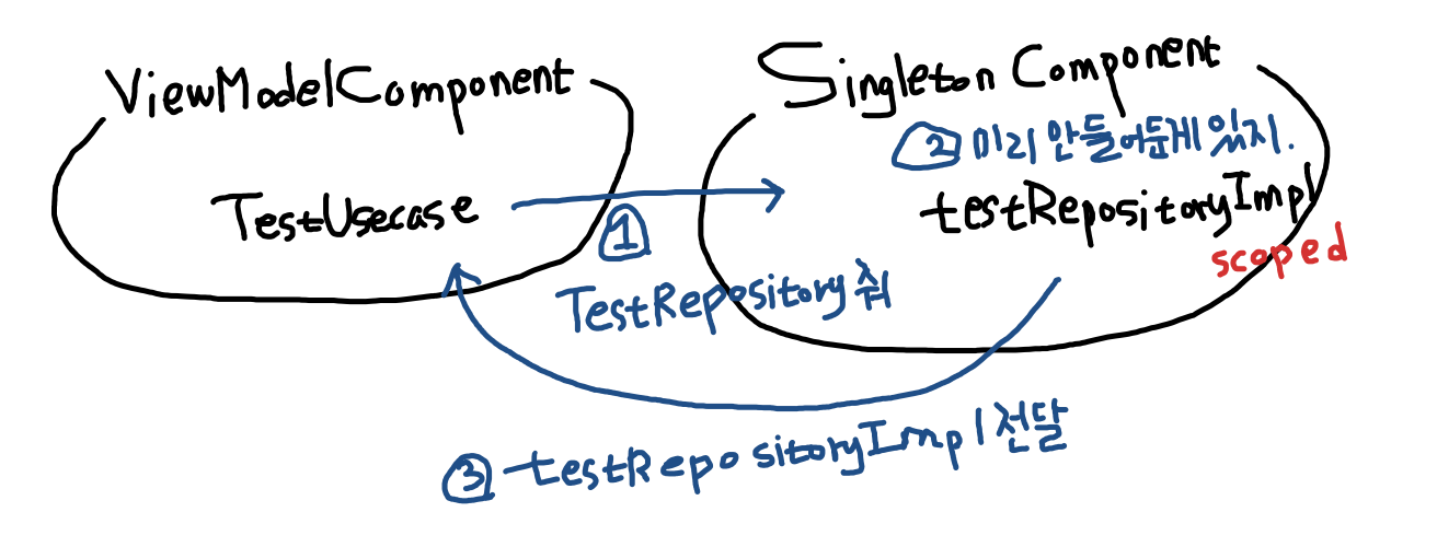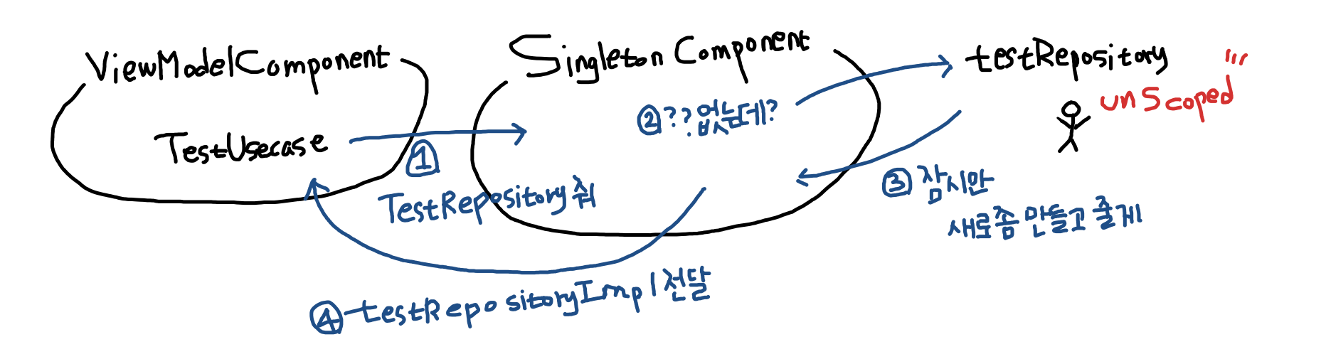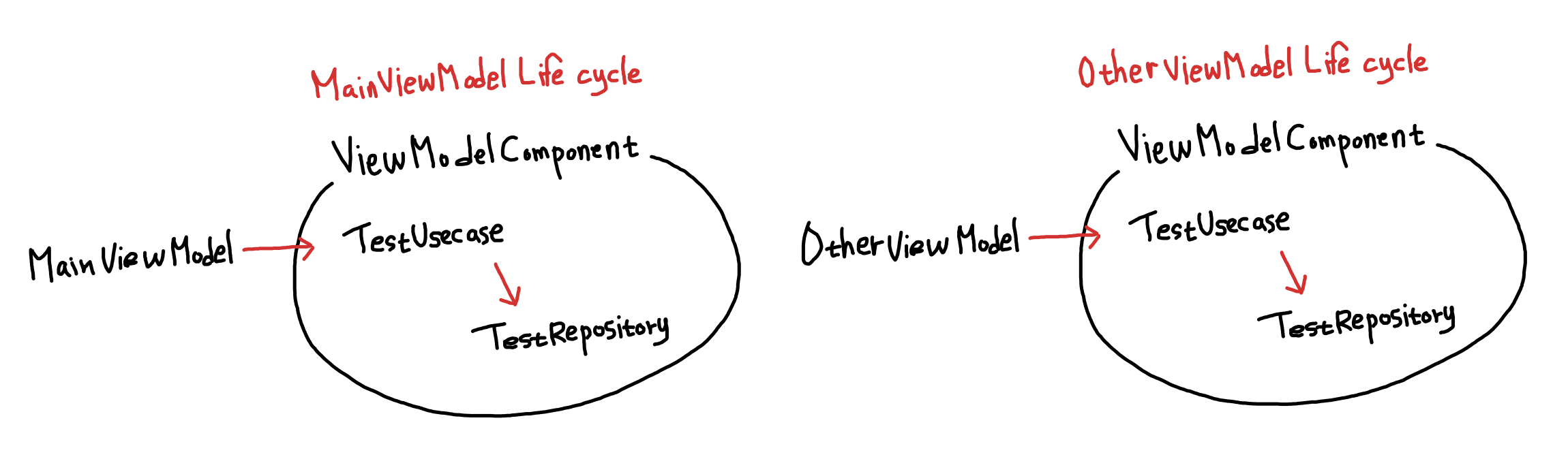 이전에도 말했든 ViewModelScoped로 지정된 UseCase와 Repository는 ViewModelComponent에 속하게 되고, 이는 각 ViewModel 라이프사이클에 의해 관리되고 있기 때문입니다.