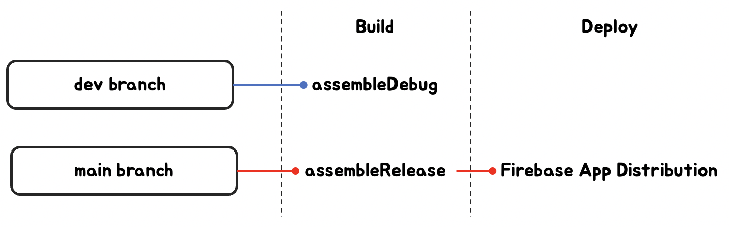 Firebase App Distribution에 테스트 앱을 배포해야 하는 작업이 필요하므로 dev branch보다 조금 더 복잡합니다. 😭