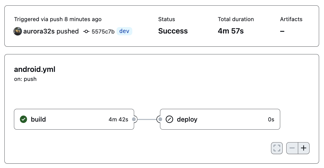 이전에 말씀드렸듯이 dev branch에 경우에는 build만 수행하도록 하는것이 목표였기 때문에 deploy까지 수행하지 않고 build에서 성공적으로 완료한 것을 볼 수 있습니다. 🔥👍🏻