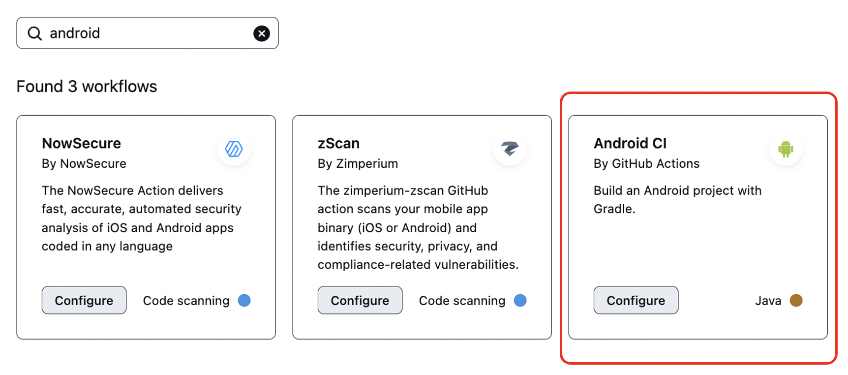 해당 tab에서 android를 검색하게 된다면 👇🏻아래와 같이 Android를 위한 CI를 볼 수 있어요.