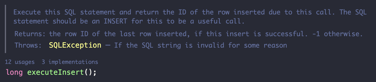 이 때 최종적으로 호출하는 것이 바로 executeInsert 메서드이며, 반환값이 long으로 정의되어 있는 것을 알 수 있습니다. 😆